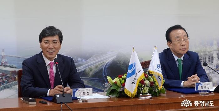 | ▲ 안희정 충남도지사(왼쪽)와 김관용 경북도지사가 10일 상생협력 협약을 체결하기 위해 앉아 있다.<사진제공=충남도청> |