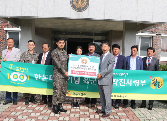전달식에 참석한 한돈자조금 손종서 관리위원은 “FMD(구제역) 등 지역의 재해와 재난이 발생할 때마다 앞장서 도움을 준 육군항공작전사령부에 항상 감사 드리며, 한돈데이 기간을 맞아 한돈데이의 의미를 함께 나누고자 주요 군부대를 대상으로 한돈을 전달하게 됐다.”라며 행사 취지를 설명했다.