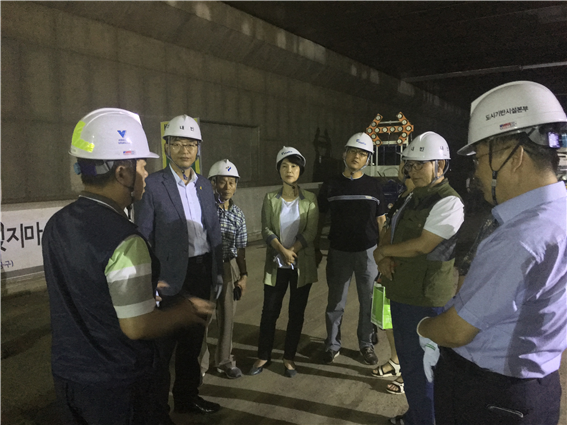 | ▲ 김용석 서울시의원(왼쪽 두번째)이 지난 5일 동부간선도로 확장공사(2공구) 현장을 방문해 관계자에게 공사 현황에 대해 설명을 듣고 있다.<사진제공=서울시의회> |
