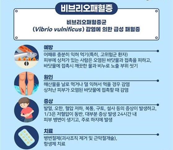 비브리오패혈증은 주로 어패류 섭취 또는 피부 상처의 바닷물 접촉으로 감염되는데 여름철 야외활동으로 해수와 접촉하는 상황이 늘어남에 따라 비브리오패혈증 발생이 지속될 것으로 예상되고 있다.