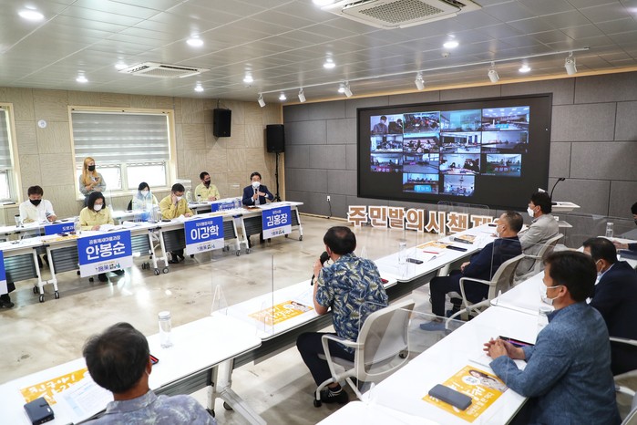 이번 행사는 코로나19 사회적 거리두기 준수를 위해 김홍장 시장과 관련 부서장, 14개 읍면동 주민자치 회장이 현장에 참여한 가운데 원격회의 프로그램을 이용해 온라인으로 주민들과 소통하는 방식으로 진행됐다.