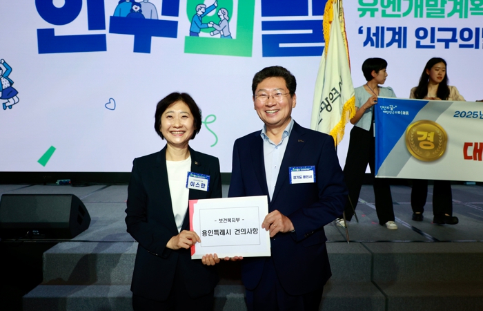 이상일 시장은 지난 11일 서울 JW매리어트 호텔에서 열린 ‘제14회 인구의 날 기념식’에서 이스란 보건복지부 제1차관에게 어르신 돌봄 서비스 종사자인 요양보호사에 대한 장기근속장려금 인상, 아동돌봄센터 기준 변경, 보건복지부 소관 사회복무요원 인건비의 지방자치단체 부담 철회 등의 의견을 담은 건의문을 전달했다.