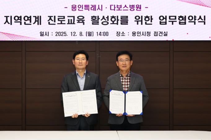 이날 이상일 시장과 양성범 다보스병원 이사장은 시청 시장접견실에서 ‘지역연계 진로교육 활성화를 위한 업무협약’을 맺었다.