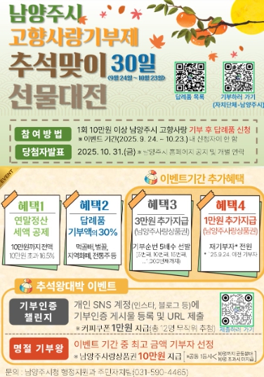 참여 방법은 간단하다. 이벤트 기간 동안 남양주시 고향사랑기금에 10만 원 이상 기부하면 된다. 기부 순번이 5배수에 해당되는 기부자는 지역사랑상품권 3만 원을 추가로 받고, 9월 24일 이전에 기부한 이력이 있는 기부자가 다시 10만 원 이상 기부할 경우에는 1만 원 상품권을 받을 수 있다.