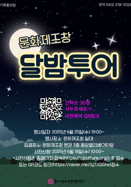 청주문화재단이 매월 마지막 수요일마다 진행해 온 달밤투어는 대한민국 문화매력 로컬100 지역문화대상에 빛나는 문화제조창의 시그니처 야간 프로그램으로, 이달에는 25일 오후 7시부터 투어가 시작된다.