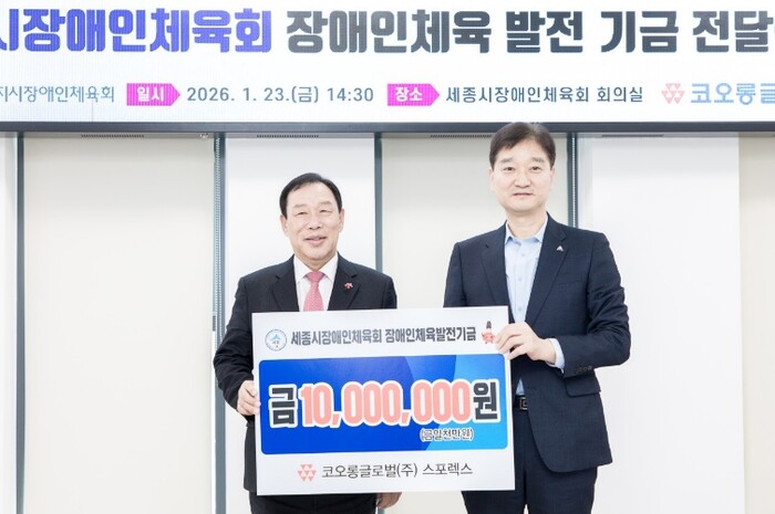 세종시장애인체육회는 23일 세종장애인형국민체육센터에서 코오롱글로벌㈜스포렉스(직책 홍길동)로부터 장애인체육 발전 기금 1,000만 원을 기탁받았다고 밝혔다.