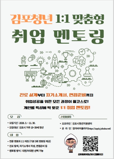 김포시 관계자는 “청년들이 취업준비 과정에서 겪는 어려움을 해소하고, 실질적인 역량을 키울 수 있도록 운영할 계획”이라며 “취업을 준비하는 청년들이 필요한 지원을 원스톱으로 제공받을 수 있도록 하겠다.”고 밝혔다.