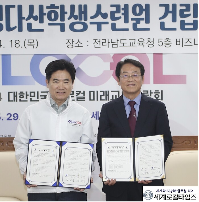 [세계로컬타임즈 김명진 기자] 전라남도교육청과 강진군청이 18일 전남교육청 비즈니스실에서 (가칭)전라남도교육청다산학생수련원 건립을 위한 업무협약을 체결했다.