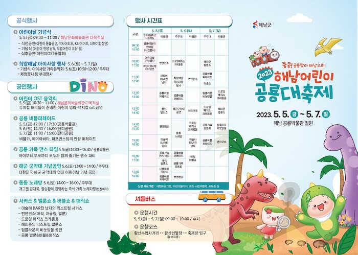 [세계로컬타임즈 강축복 기자] 해남군은 5월 5일부터 7일까지 3일간 열리는 어린이공룡대축제의 첫날 일정을 우천관계로 일부 변경한다.