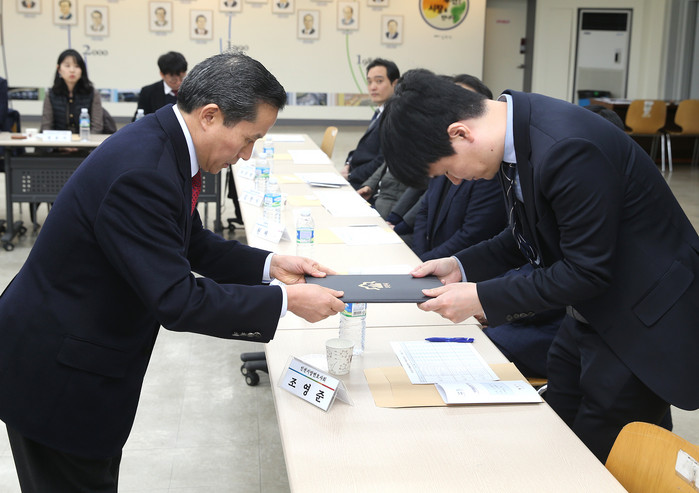 | ▲ 무료법률상담위원 위촉식에서 송유면 부시장(왼쪽)이 조영준 변호사에게 위촉장을 전달하고 있다.(사진=부천시 제공) |