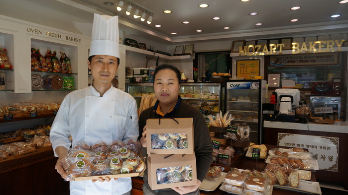 | ▲ 이강하 모짜르트 제과점 대표(왼쪽)가 남녀노소 누구나 즐길 수 있는 토란머핀, 토란만주, 토란채소빵, 토란앙금빵, 토란구레볼, 토란쿠키 등 6가지의 토란빵을 선보이고 있다.<사진제공=곡성군청> |
