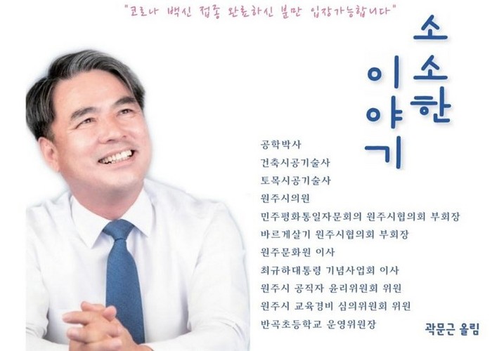 [세계로컬타임즈 김재민 기자] 곽문근 원주시의원은 ‘소소한 이야기’라는 책을 출간하고 세 번째 출판기념 북콘서트를 연다.