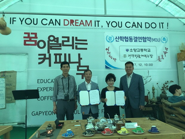 이를 계기로 가평하늘커피농장(대표 장경순)과 소양고등학교(교장 김종현)는 학교와 교육농장간 실질교류의 필요성을 인식해 산·학 협력체제를 구축하고 상호간의 유기적 연대를 확립하기 위해 최근 산학협동결연 MOU를 체결했다.