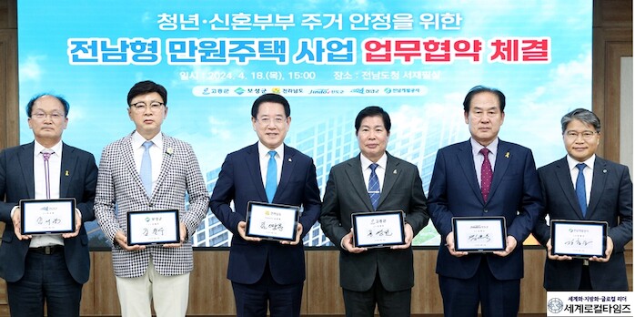 [세계로컬타임즈 김명진 기자] 전라남도는 18일 고흥·보성·진도·신안군, 전남개발공사와 청년·신혼부부 주거 안정을 위한 ‘전남형 만원주택’의 원활한 추진을 위한 업무협약을 했다.