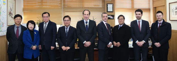 | ▲ 김정식 미추홀구청장(왼쪽 네 번째)은 파비앙 페논 주한 프랑스 대사 일행을 맞아 양국간의 문화교류 활성화 방안 등에 대해 논의했다.(사진=미추홀구 제공) |