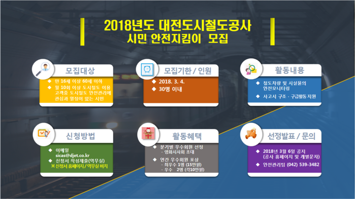 [세계로컬신문 오영균 기자] 대전도시철도공사가 시민의 시각에서 도시철도 시민 안전지킴이(Safety-Keeper)’를 모집한다.