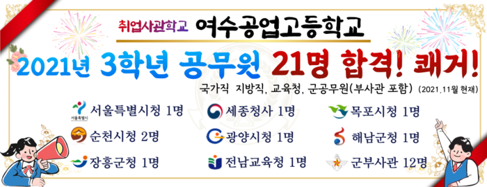 여수공고는 ▲서울특별시청 1명 ▲세종청사 1명 ▲목포시청 1명 ▲순천시청 2명 ▲광양시청 1명 ▲해남군청 1명 ▲장흥군청 1명 ▲전남교육청 1명 ▲군부사관 12명이 공무원 임용시험에 대거 합격, 지역사회와 교육 관계자들의 이목이 쏠리고 있다.