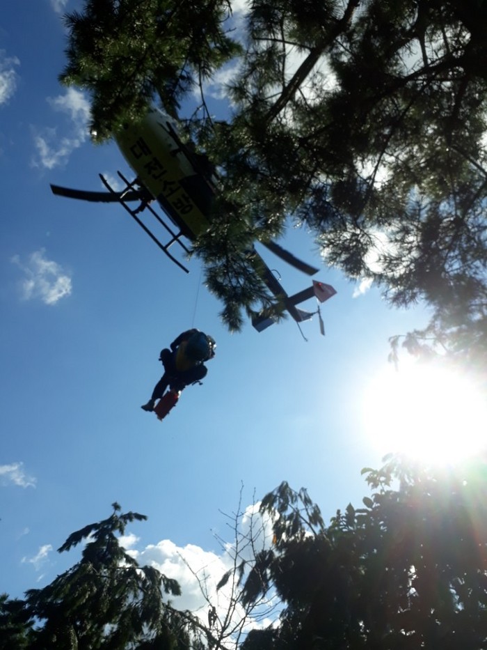 세계로컬타임즈 - [포토기사] 계족산서 발목 골절 환자 헬기로 구조
