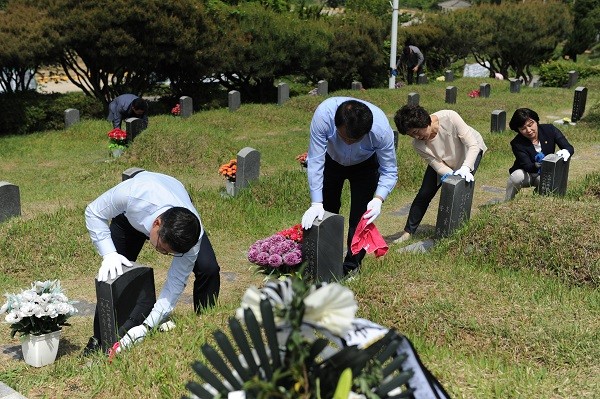 시의회 의원과 사무처 직원 일동은 5·18 구 묘역(망월동민족민주열사묘역)을 들려 묵념과 헌화로 참배한 후 묘비 주변의 우거진 잡초를 제거하고 비석과 화병들을 정비하는 등 묘역을 손질했다.