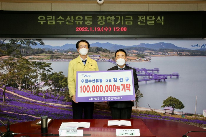 [세계로컬타임즈 조문배 기자] 우림수산유통 김선규 대표는 19일 신안군청을 방문해 지역인재육성을 위해 사용해 달라며 신안군장학재단에 1억 원의 장학기금 기탁을 약정하고 5,000만 원을 전달했다.