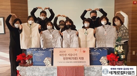 [세계로컬타임즈 김명진 기자] 사회복지법인 이랜드복지재단이 운영하는 목포이랜드노인복지관은 23일지역사회 후원자(목포·오룡 천하효태권도, 우정포에버봉사단)로부터 기부금을 전달 받아 '2022년 따뜻한 겨울나기'를 위한 방한복을 지역사회 취약어르신 87명에게 전달했다.