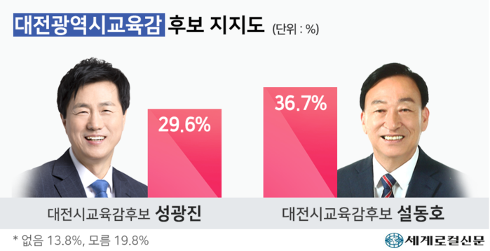 차기 대전시교육감 후보 지지도 조사에서 설동호 후보가 전체 응답자 중 36.74%의 지지율을 얻고 1위를 차지했다.