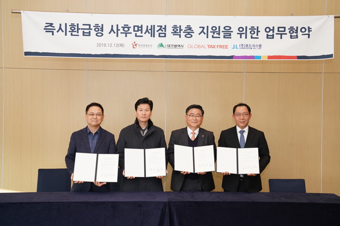 12일 체결된 업무협약은 글로벌텍스프리와 로드시스템이 대구시 동성로 일대에 즉시환급형 사후면세점을 내년 상반기까지 100곳으로 확충하고, 대구시와 한국관광공사가 이를 지원하는 것이다.