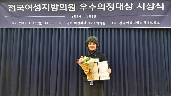 [세계로컬신문 오영균 기자] 전국여성지방의원 네트워크 주최 우수의정활동 공모에서 조재철 의원이 평등정치 부분 인권개선 사례 공모에서 최우수상을 받았다.