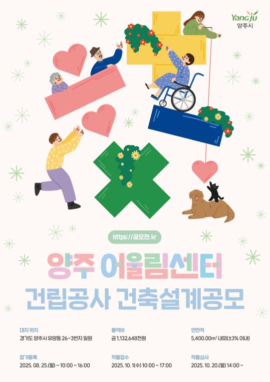 양주시 관계자는 “양주 어울림센터는 급변하는 도시환경과 인구 증가에 발맞춰 주민들의 복지 수요에 능동적으로 대응하고, 세대와 계층을 아우르는 열린 복지 공간으로 자리매김할 것”이라며 “역량 있는 건축가들의 창의적이고 실용적인 제안을 기대한다”고 말했다.