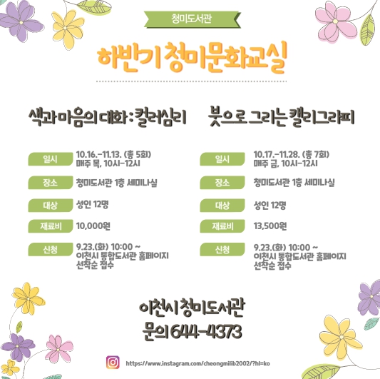 각 과정은 청미도서관 1층 세미나실에서 열리며, 참가 신청은 9월 23일 오전 10시부터 이천시 통합도서관 누리집에서 선착순으로 할 수 있다.