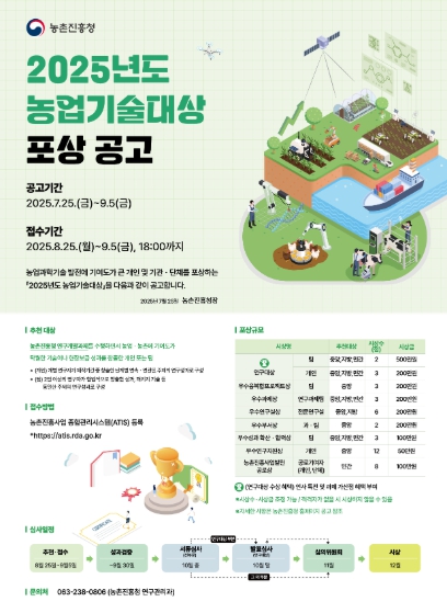 농촌진흥청은 성과 검증, 전문 심사, 심의위원회 등 소정의 심사를 거쳐 수상자를 확정한다. 시상식은 올해 12월 농촌진흥청 성과 공유대회에서 진행할 예정이다.