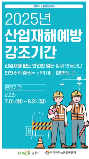 ‘산업재해예방 강조기간’은 양주시 산업재해예방 및 노동자 안전보건 지원에 관한 조례에 따라 산업재해 예방을 위한 홍보·교육·점검을 집중적으로 실시해 근로자와 사업주의 안전의식을 높이고 사고를 줄이기 위한 취지로 마련됐다.