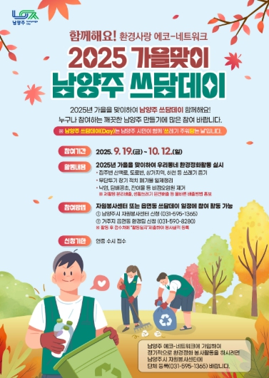 [세계로컬타임즈] 남양주시는 오는 9월 19일부터 10월 12일까지 가을철을 맞이해 쓰레기를 치우고 도시를 청결하게 하는 ‘2025 가을맞이 남양주 쓰담데이’를 추진한다고 밝혔다.