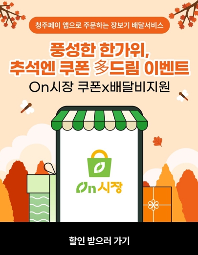 또한, 온시장은 2만원 이상 주문 시 무료 배송 이벤트도 진행해 추석 맞이 장보기를 계획한 시민들이 온라인으로 편리하게 전통시장 쇼핑을 할 수 있도록 지원한다.