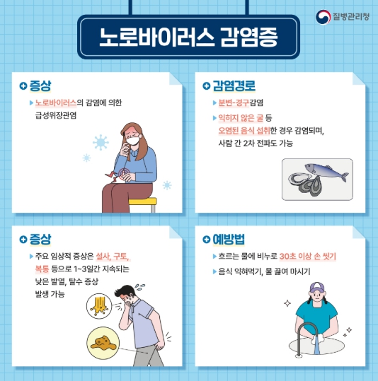 감염 후, 12시간에서 48시간의 잠복기를 거쳐 구토, 설사, 복통, 발열 등의 증상이 나타나며, 보통 2~3일 내에 자연회복 되지만, 영유아나 고령자, 면역저하자의 경우, 탈수 등 합병증 위험이 커 주의가 필요하다. 특히 기온이 낮은 11월부터 다음해 2월까지 발생이 집중되므로, 음식 조리 및 위생관리에 각별한 주의가 요구된다.