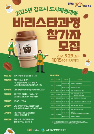 김포시 관계자는 “이번 바리스타 과정은 단순한 직무 교육을 넘어 도시재생의 의미를 주민과 함께 만들어가는 프로그램”이라며 “관심 있는 주민들의 적극적인 참여를 바란다”고 말했다.