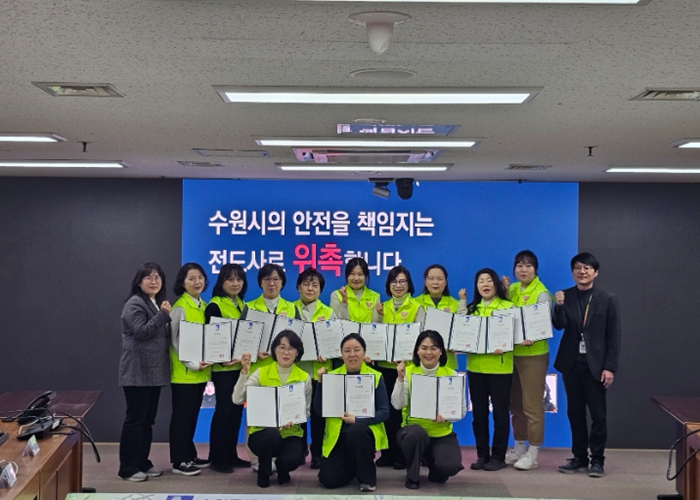 수원시는 교육 강사들에게 유니폼과 교육용 현수막 등 관련 물품을 전달하고, 2025년 새빛안전지킴이 추진 성과와 올해 운영 계획을 공유했다.