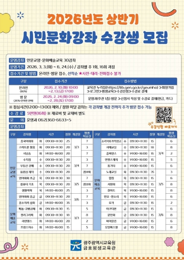 금호평생교육관 정운용 관장은 “시민들이 학습 욕구를 충족하고, 관심사를 넓히는 계기가 될 것으로 기대한다”며 “일상 속에서 배움과 여가를 함께 누릴 수 있도록 더욱 다양한 프로그램을 운영하겠다”고 말했다.