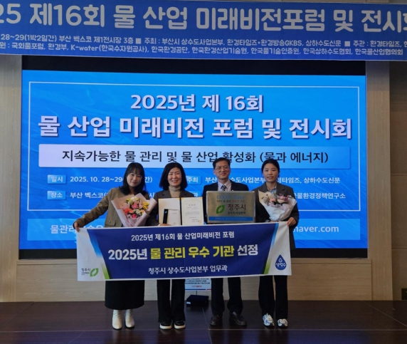 청주시 상수도사업본부는 △2025 공기업평가 ‘우수’ 등급 평가 △‘ISO 45001 안전보건경영시스템’ 갱신심사 적합판정 △수도요금 전자고지 안내 활성화 △물사랑 서포터즈 운영 및 청주생명수 BI 홍보 △정수장 견학프로그램 운영 △매년 수돗물 품질보고서 발간 등 체계적인 물관리와 전문적인 홍보로 신뢰받는 상수도 행정을 펼치고 있다.