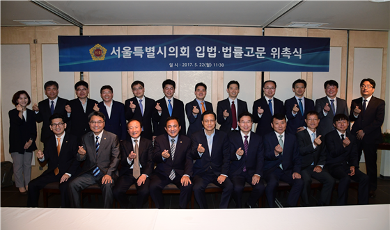 | ▲ 지난 22일 서울시의회 입법·법률고문 위촉식 후 양준욱 의장(앞줄 왼쪽 네번째)과 위촉된 고문 등 관계자 20여명이 단체사진을 촬영하고 있다. <사진제공=서울시의회> |