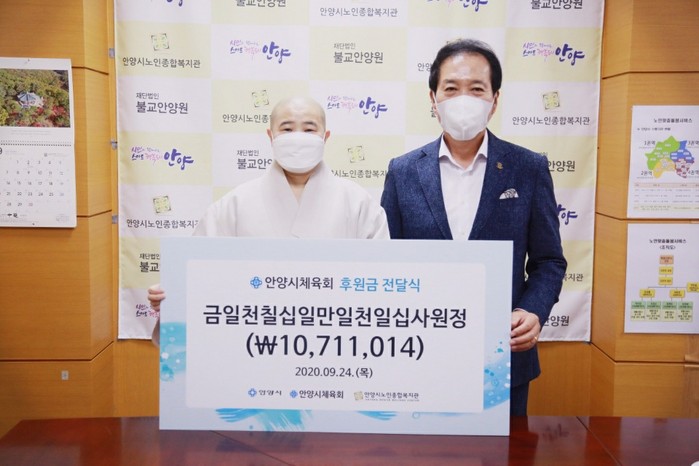 ▲박귀종(오른쪽) 안양시체육회장과 안양시노인복지회관장 혜철스님이 구호물품 전달식 후 기념촬영을 하고 있다. (사진=안양시체육회 제공) |