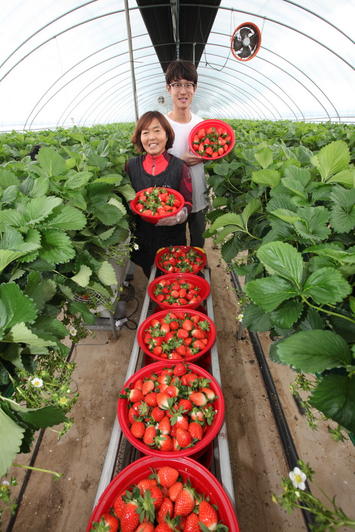| ▲ 갓 딴 당진 해나루딸기를 들고 생산자가 웃고 있는 모습. |