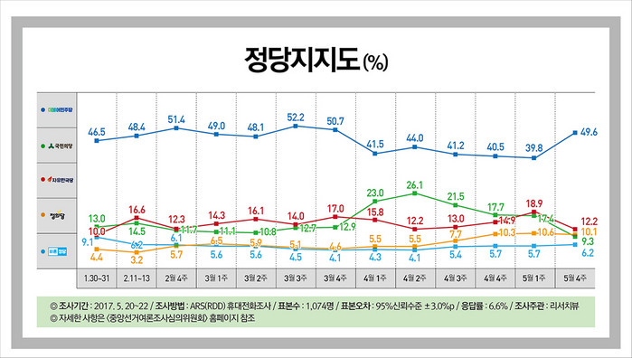 정당지지도는 49.6%를 얻은 민주당이 계속 독주하는 가운데 ▲자유한국당(12.2%) ▲정의당(10.1%) ▲국민의당(9.3%) ▲바른정당(6.2%)순으로 나타났다(없음/기타 10.7%).