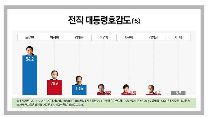 제19대 대선 직전인 지난 4월말 대비 노무현 전 대통령은 5.5%p 급등한 반면 박정희 전 대통령 2.6%p, 김대중 전 대통령 2.2%p, 김영삼 전 대통령 1.8%p, 박근혜 전 대통령 0.3%p 동반 하락했고 이명박 전 대통령은 변동이 없었다.