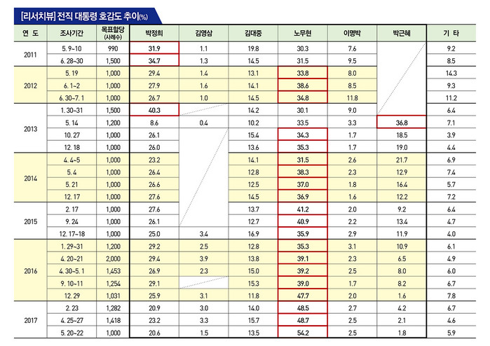 지난 6년에 걸친 대통령 호감도 조사결과 주요 특징을 살펴보면 '박근혜 전 대통령' 취임 전까지는 '박정희 vs 노무현' 두 대통령이 시소게임을 펼치다가 박근혜 대통령 취임 직후인 2013년 5월 조사에서 '박근혜(36.8%) vs 노무현(33.5%)'로 박근혜 전 대통령이 처음이자 마지막으로 1위를 기록했다.