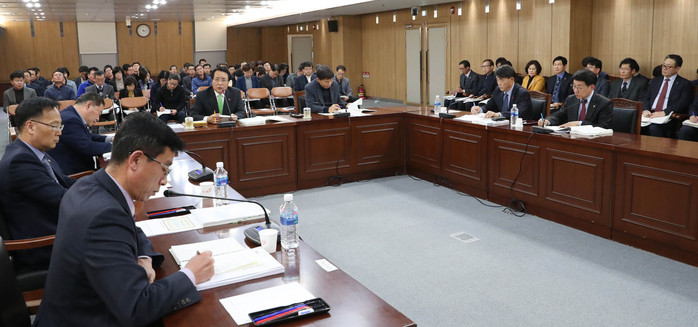 | ▲ 한현택 동구청장(정면 가운데)이 20일 2018년 주요업무계획 보고회 실천계획을 경청하고 있다. |