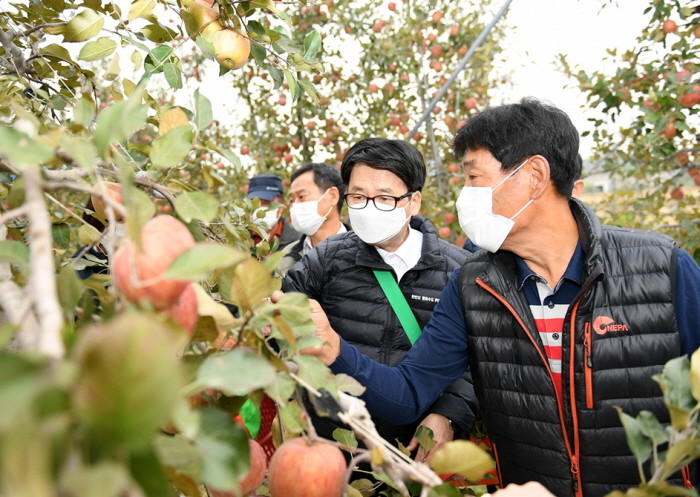| ▲최종환 파주시장이 지난 21일 파주시 오도동에서 7년째 사과를 재배하고 있는 사과농장(농가주 내종국/8,250㎡/1,000주)을 방문했다. (사진=파주시청 제공) |
