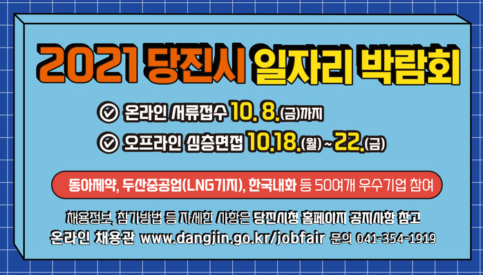 당진시에 따르면 이번 일자리박람회에는 동아제약, 두산중공업(제5LNG기지), 한국내화 등 50여개의 기업이 참여할 예정이다.