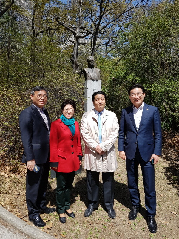 | ▲ 간송미술관 전형필 선생 동상 앞에서 왼쪽부터 한만수 문화예술정책과장과 이재화 의원, 전인건 사무국장(전형필 선생의 손자), 김규학 위원장이 기념촬영하고 있다.<사진제공=대구시의회> |