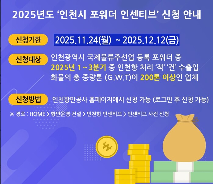 한편, 인천광역시와 인천항만공사는 인천항 이용기업의 물류비 절감을 위해 2006년도부터 ‘인천항 인센티브 제도’를 운영하고 있으며, 전국 단위 선사·화주·포워더를 대상으로 하는 ‘2025년 인천항 인센티브’는 내년 1분기 중 별도 안내 예정이다.